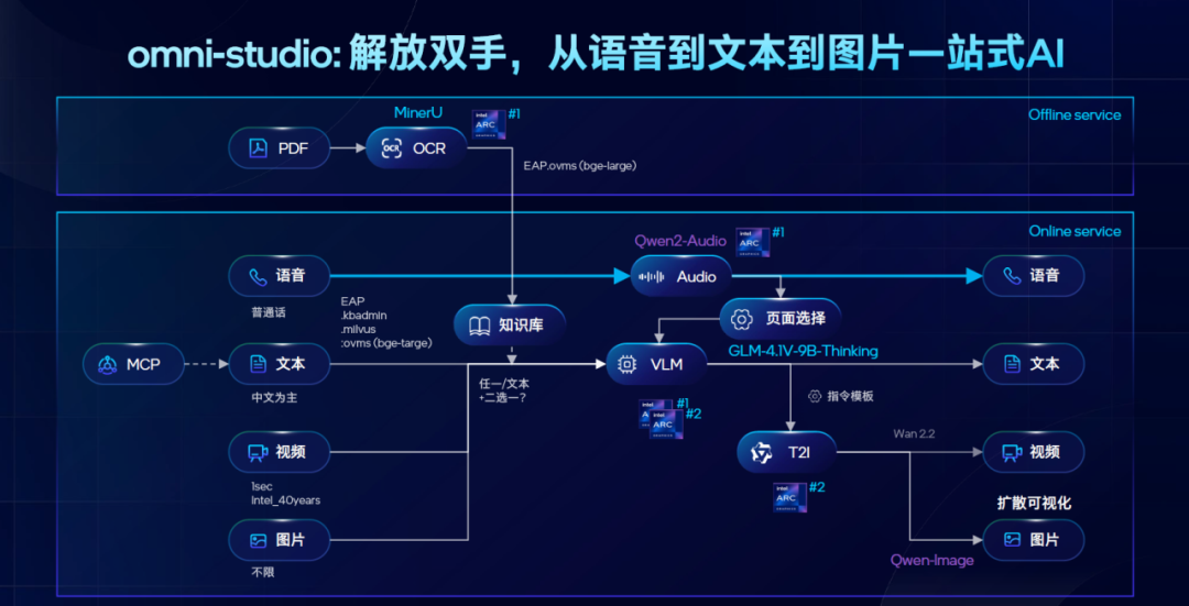 - 语音文本图片一站式AI处理:利用锐炫Pro B60强大的多模态处理能力,通过Omni Studio,可实现从语音到文本再到图片、视频的一站式AI工作流。在实际应用中,“小英”Agent(蒲公英精灵)可通过一台搭载双芯锐炫Pro B60的专业工作站,实现语音助手、VLM看图说话、OCR解析PDF文档内容,以及文生图、文生视频等复杂操作。