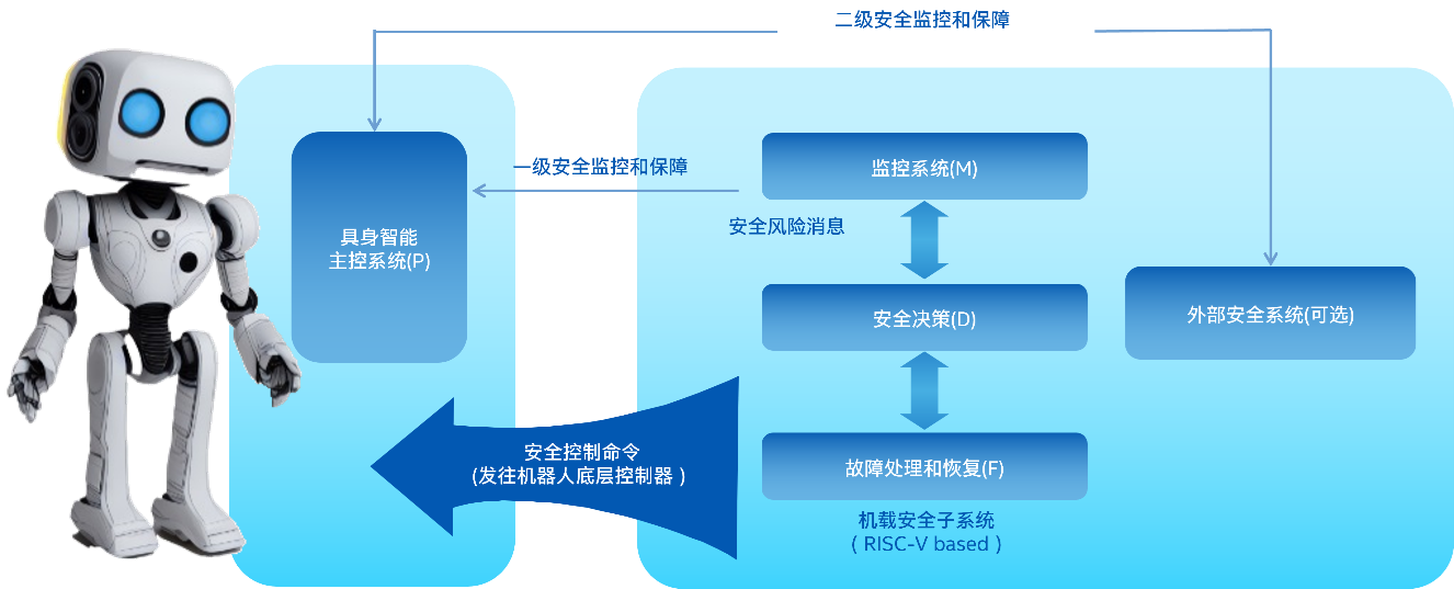 此外,《白皮书》引入了PMDF安全架构,旨在系统性地管理风险,确保机器人系统在各种复杂情况下的安全运行。该架构将带有安全功能的机器人系统按功能划分为四个逻辑上相互独立的模块,分别是具身智能主控系统(P)、监控系统(M)、安全决策(D)和故障处理和恢复(F)。M、D、F三个模块组成一个安全子系统,可通过RISC-V等单独的硬件实现,既能保障高安全性,又可以直接放在机器人本体上部署。各模块之间协同合作,共同构建起坚实的安全防线。