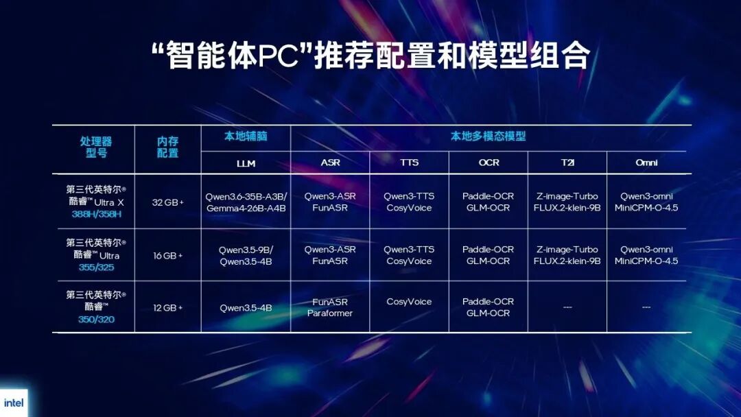 - 旗舰配置:搭载第三代酷睿Ultra X系列处理器并配备32GB以上内存,能够流畅运行Qwen3.5/3.6(35B)、Gemma4(26B)等大型语言模型及Qwen3-VL、MiniCPM-O-4.5等复杂多模态模型,并同时支持主流与入门级模型和应用。