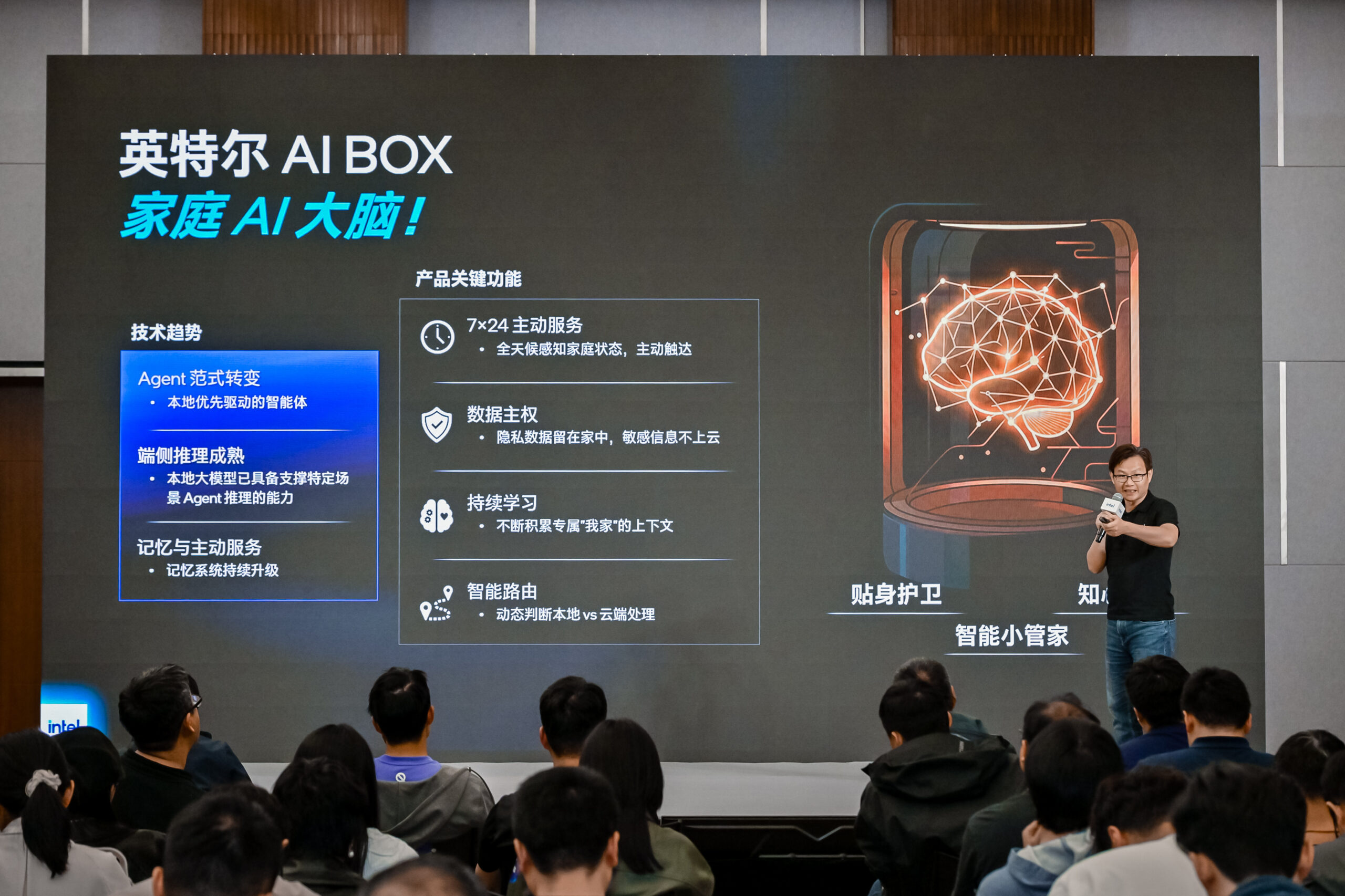 英特尔将AI创新延伸至家庭场景,推出了“家庭AI大脑”——AI Box。它构建了以家庭本地算力为核心、云端能力为辅的混合智能架构。作为部署于用户家中的私有AI中心与智慧中枢,它从架构层面强化了家庭数据的保护,让用户从容享受AI的便捷。