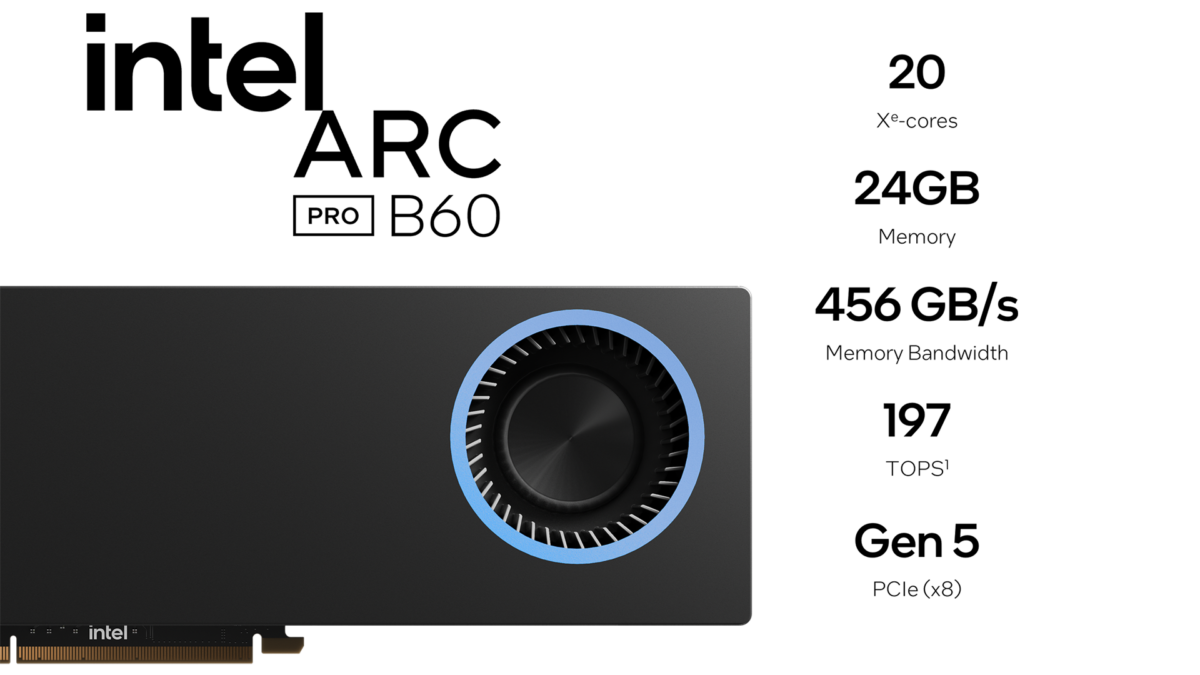 1成本估算基于截至 2025 年 9 月,使用英特尔至强 w7-2475x、4 块 Arc Pro B60 双 GPU 卡和 2 个 64GB DDR5 5600MHz 内存条的配置,通过公共和合作伙伴采购获得的内部估算。