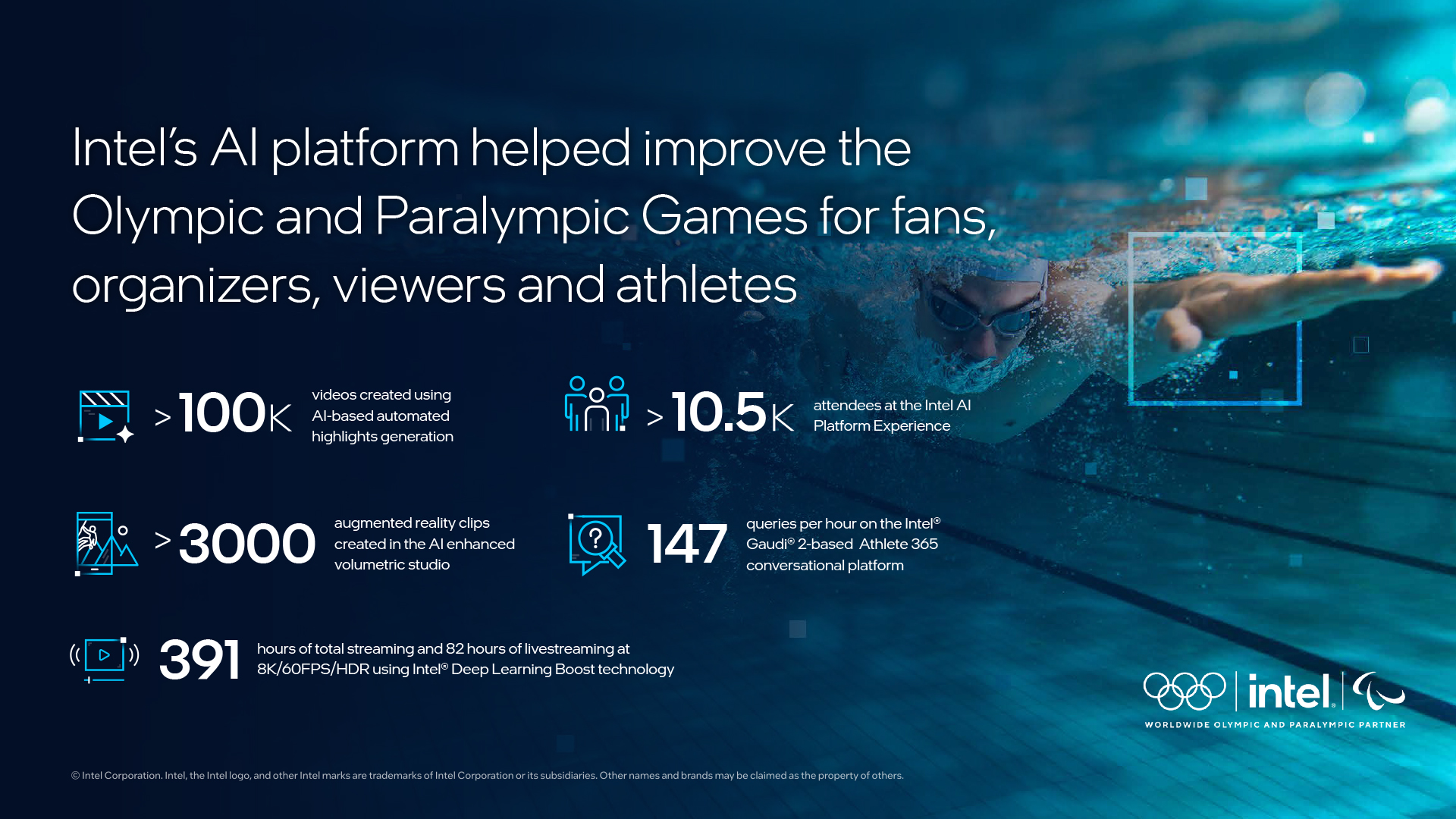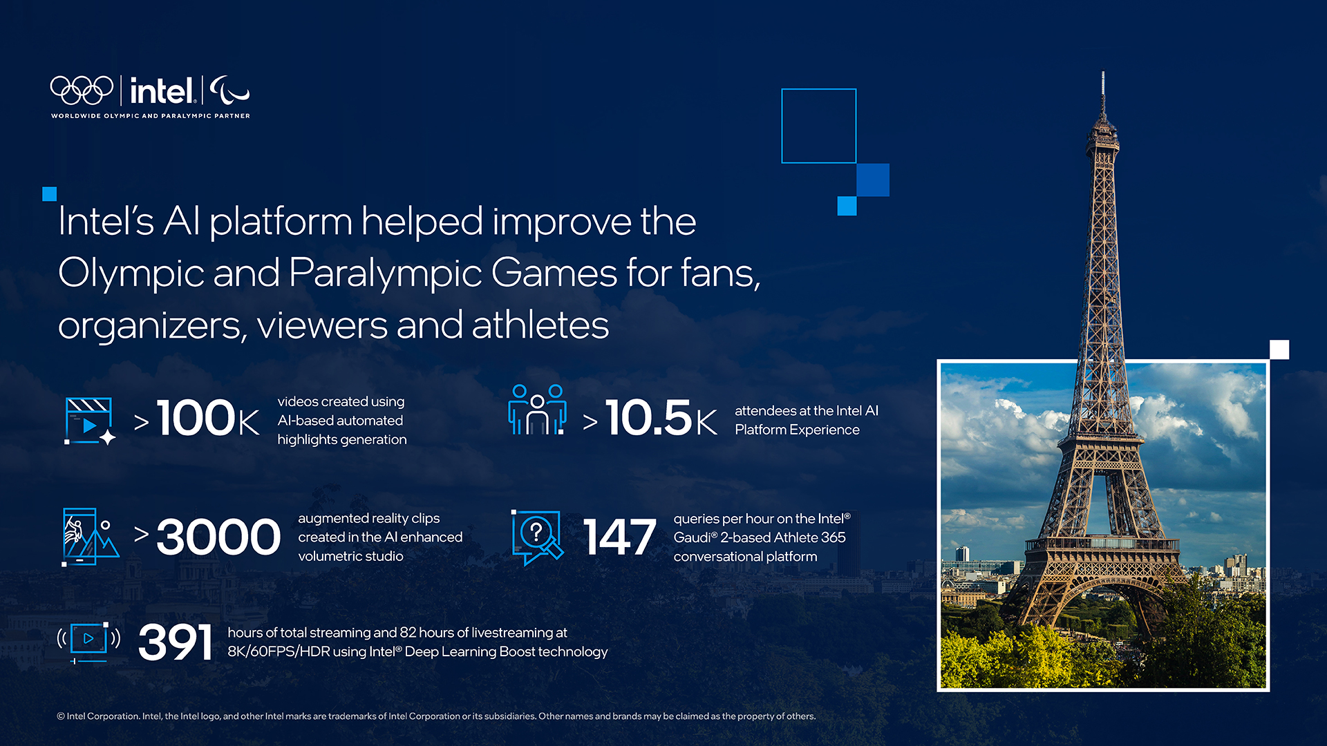Why It Matters:  With 9.5 million tickets sold and 10,500 athletes on-site, Paris 2024 celebrated 32 Olympic sports organized over 750 competition sessions. With record crowds in Paris, plus billions of television viewers, Intel’s AI platform technology provided first-of-their-kind experiences for fans, revolutionary broadcast solutions, and streamlined operational management for athletes and organizers.How Intel AI Platforms Delivered an Immersive On-Site Activation to Fans:  Intel’s AI Platform Experience, in collaboration with Samsung, provided an AI-powered fan activation to take attendees on the journey of discovering their ideal Olympic sport. Trained on Intel® Gaudi® AI accelerators, running on Intel® Xeon® processors with built-in AI acceleration and optimized with OpenVINO™, the activation used AI and computer vision to analyze athletic drills and match each participant’s profile to an Olympic discipline. More than 10,500 attendees participated in the activation. Decathlon/heptathlon were the most identified Olympic sport among participating fans, with rowing identified as the most rare. The activation celebrated Olympic sports of all disciplines and demonstrated the power of AI to improve talent detection and athlete  training.How Xeon Processors Helped Revolutionize Olympic Broadcasting:  Estimates are that  more than half of the world’s population engaged via broadcast or digital channels with the Olympic Games Paris 2024. With more than 11,000 hours of content produced by Olympic Broadcasting Services (OBS), Intel’s processors and AI platform technology streamlined workflows to help bring more engaging content to fans faster than ever.